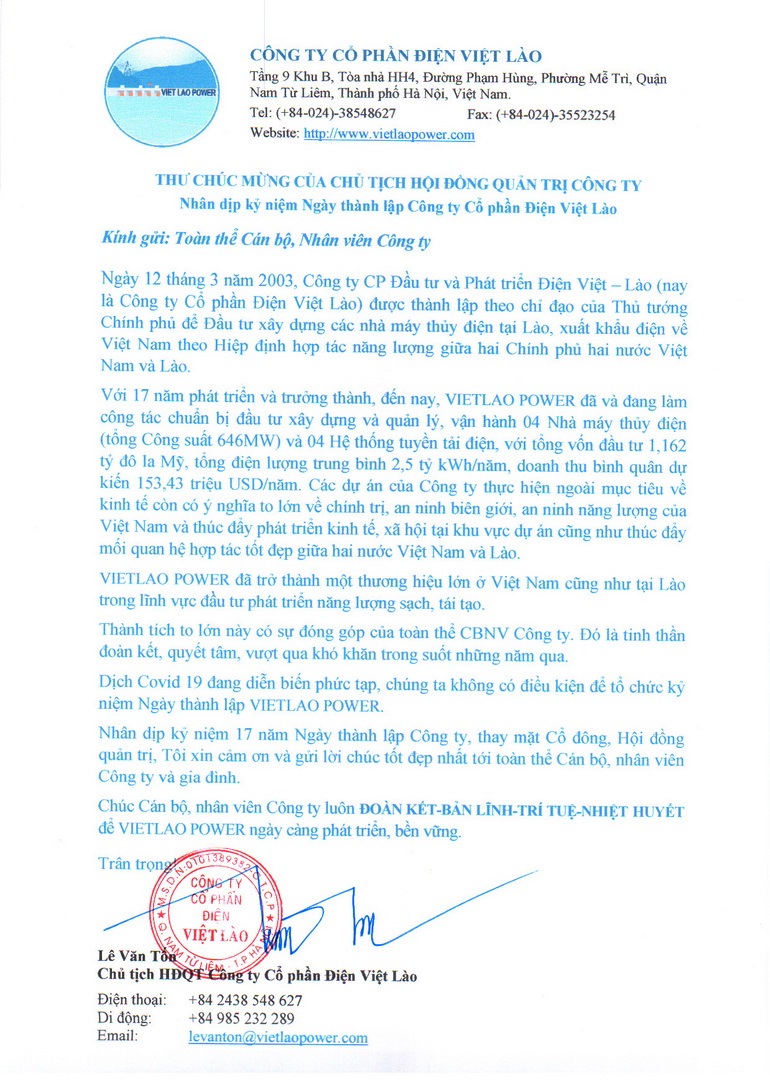 Nhân dịp kỷ niệm 17 năm Ngày thành lập Công ty Cổ phần Điện Việt Lào (Thành lập ngày 12 tháng 3 năm 2003 với tên là Công ty Cổ phần Đầu tư và Phát triển Điện Việt – Lào), Ông Lê Văn Tốn - Chủ tịch Hội đồng quản trị Công ty gửi thư chúc mừng tới toàn thể Cán bộ, nhân viên Công ty.