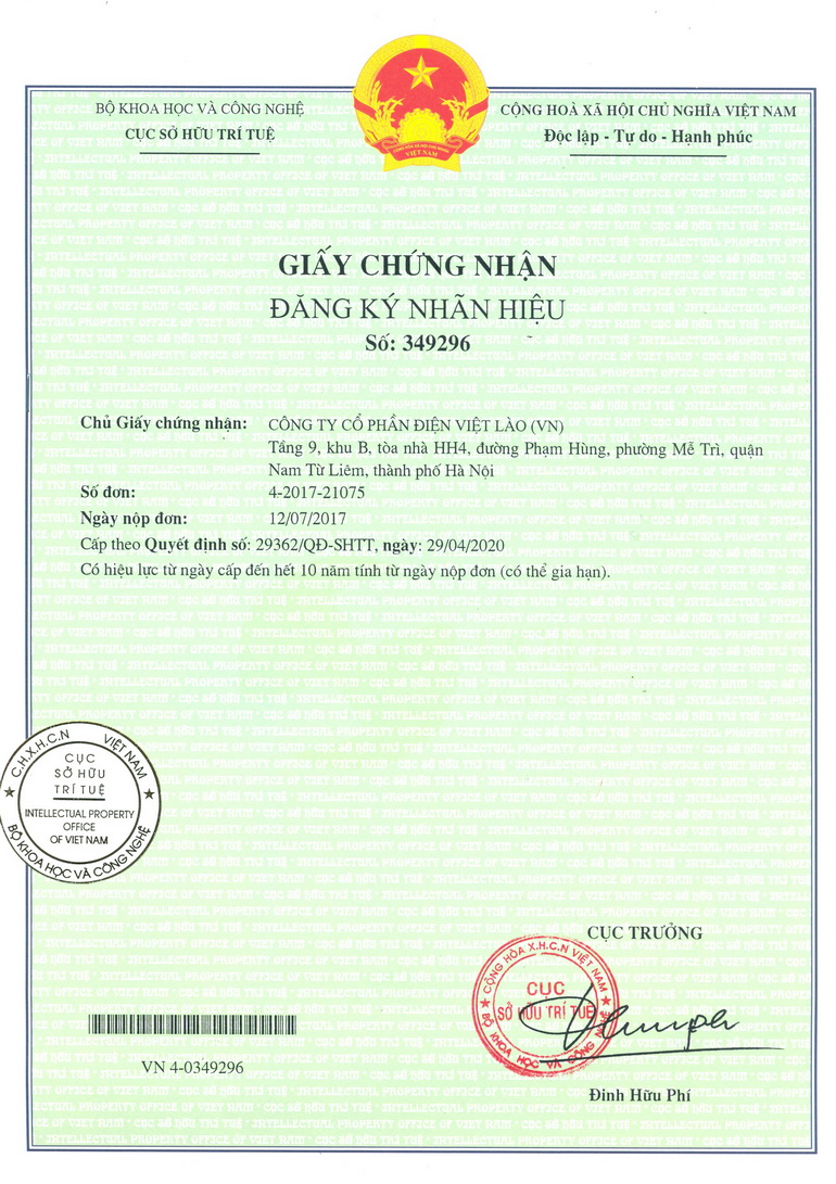 Ngày 29/4//2020, Cục Sở hữu Trí tuệ - Bộ Khoa học và Công nghệ đã cấp Giấy chứng nhận đăng ký nhãn hiệu cho Công ty cổ phần Điện Việt Lào.