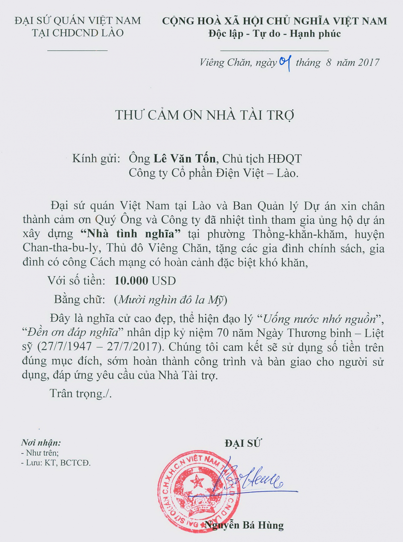 Đại sứ quán Việt Nam tại nước CHDCND Lào đã gửi Thư cảm ơn Công ty cổ phần Điện Việt Lào đã tham gia ủng hộ Dự án xây dựng “Nhà tình nghĩa” tặng gia đình chính sách, gia đình có công với Cách mạng có hoàn cảnh đặc biệt khó khăn đang sinh sống tại Lào nhân dịp kỷ niệm 70 năm ngày thương binh liệt sĩ (27/7/1947 - 27/7/2017). Theo đó, Công ty cổ phần Điện Việt Lào đã tài trợ số tiền 10.000 Đô la Mỹ để Đại sứ quán Việt Nam thực hiện Dự án xây dựng “Nhà tình nghĩa”. Đây là tấm lòng của toàn thể CBCNV Công ty Cổ phần Điện Việt Lào đối với các Gia đình chính sách, gia đình có công với Cách mạng, là nghĩa cử cao đẹp, thể hiện đạo lý “Uống nước nhớ nguồn” “Đền ơn đáp nghĩa”.