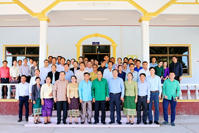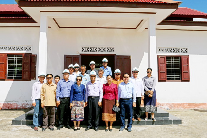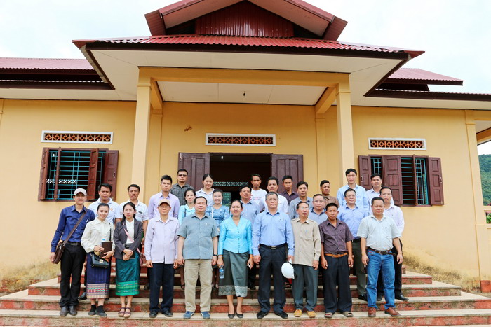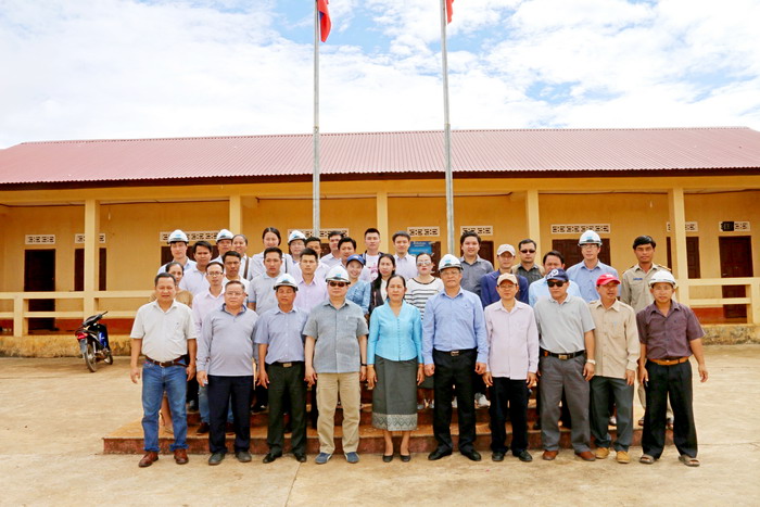 Đoàn đại biểu chụp ảnh lưu niệm trước Trường học tại khu TĐC Souksavang Dakbou